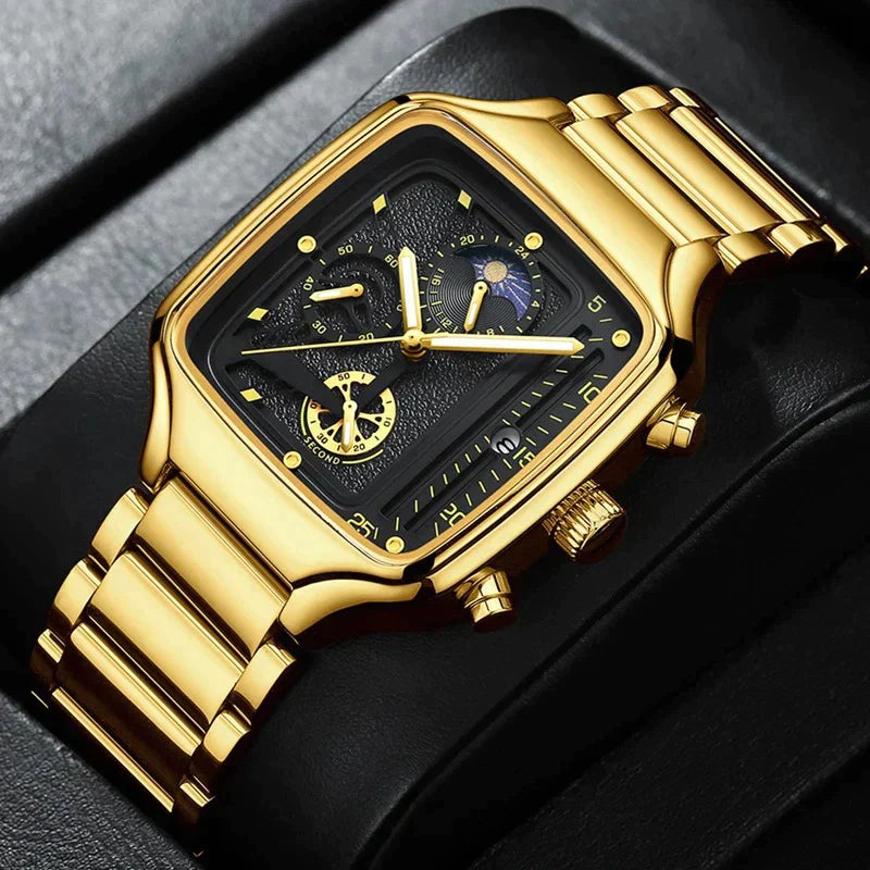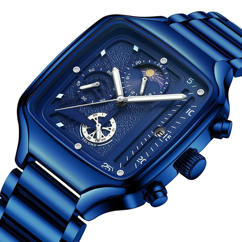 - Zusatzfunktionen: Chronograph, Komplettkalender, Mondphase, Wasserdicht, Leuchtende Zeiger
